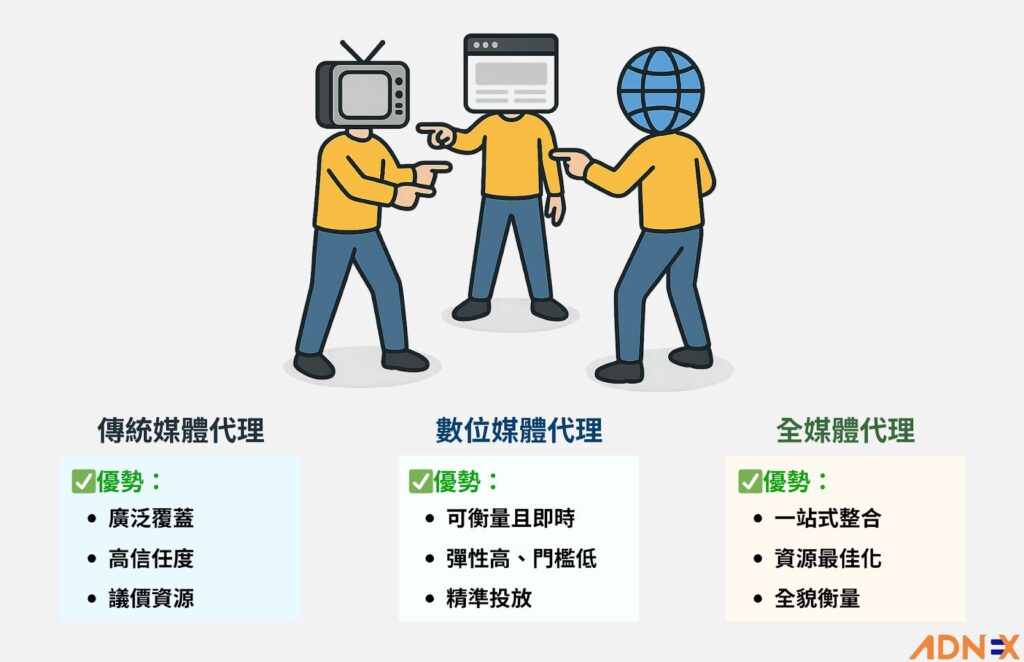 | 特性 | 📺傳統媒體代理 | 💻數位媒體代理 | 🌐全媒體代理 |