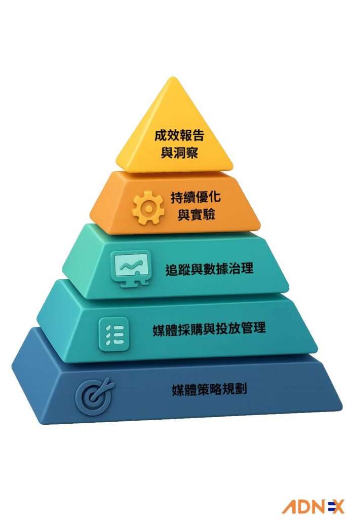 範圍:釐清商業與行銷目標、設定KPI與受眾、規劃通路組合(如搜尋、社群、影音、程序化、戶外等)、預算與檔期配置。