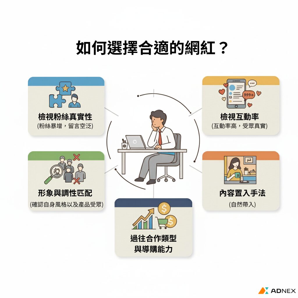選擇適合的網紅行銷公司除了要根據品牌方自身需求外,還須評估行銷公司過往合作品牌、平台資源、報價透明度與專業管理能力等。