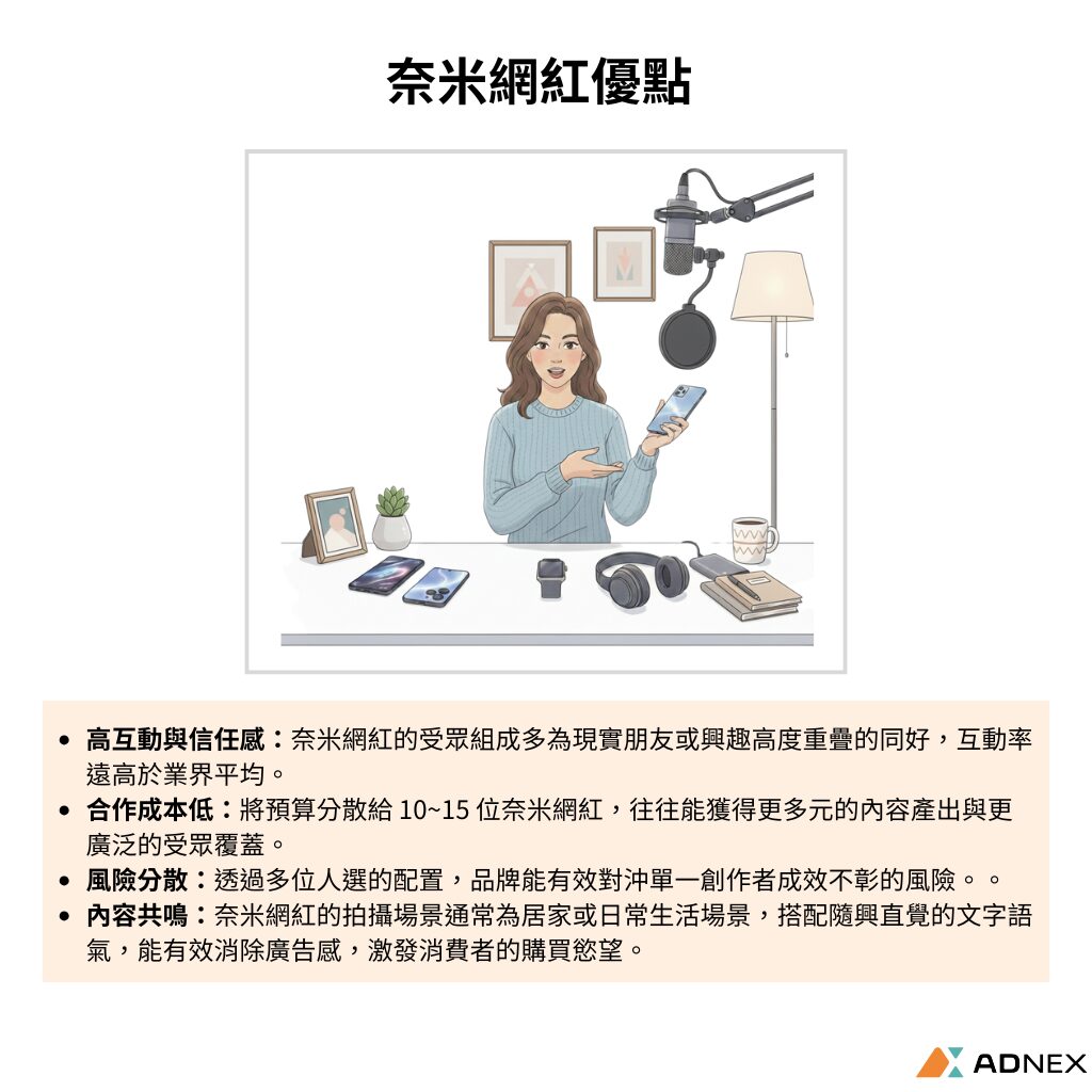 - 注意事項:微網紅粉絲數較低,能獲取的曝光有限。此外,預算有限的品牌需要親自與多位網紅聯繫,中間往返的訊息時間與人力成本也必須納入考量。