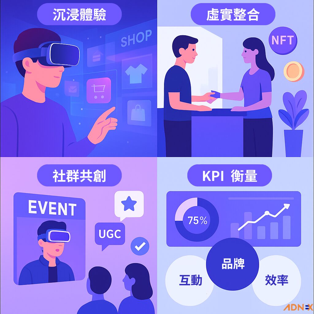 - 沉浸式品牌體驗:建置虛擬旗艦店、產品情境模擬,讓用戶體驗在虛擬空間進行試穿、試用,縮短從認知到決策的距離,提升參與度與轉換率。