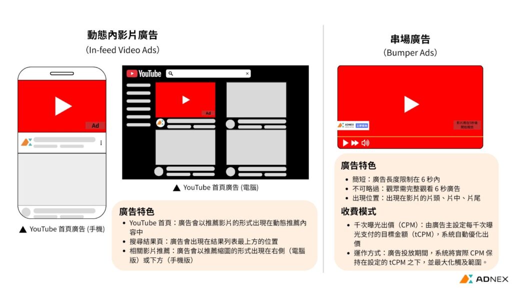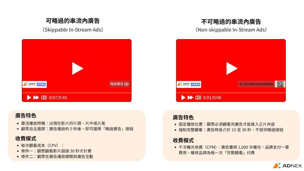 | 計費方式 | CPV(Cost-Per-View):觀看 30 秒或互動才計費 | CPM(Cost-Per-Mille):每次曝光都計費 |
